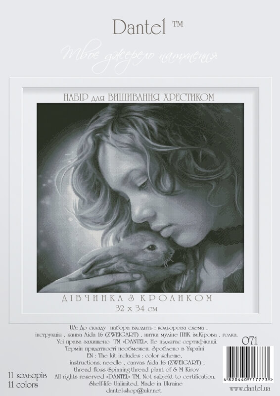 Набор для вышивания крестом Девочка с кроликом ТМ Dantel содержит мулине ПНК им. Кирова, канву Aida 16, символьную схему, иглу и инструкцию.