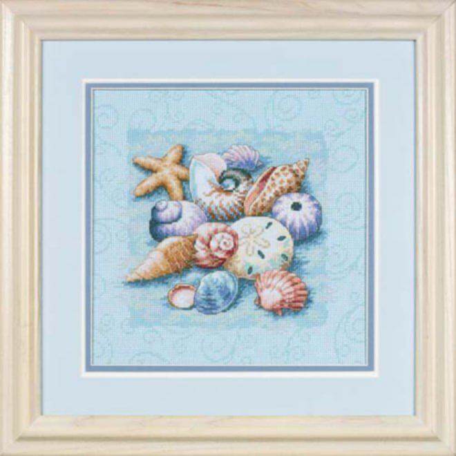 СНЯТО С ПРОИЗВОДСТВА. Набор для вышивки крестом Ракушки на голубом фоне, ТМ Dimensions, арт. 1058917, 25x25см