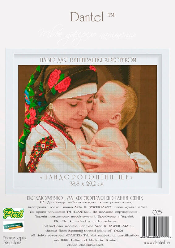 Набор для вышивания крестом Самое дорогое ТМ Dantel содержит мулине PERI, канву Aida 16, символьную схему, иглу и инструкцию.