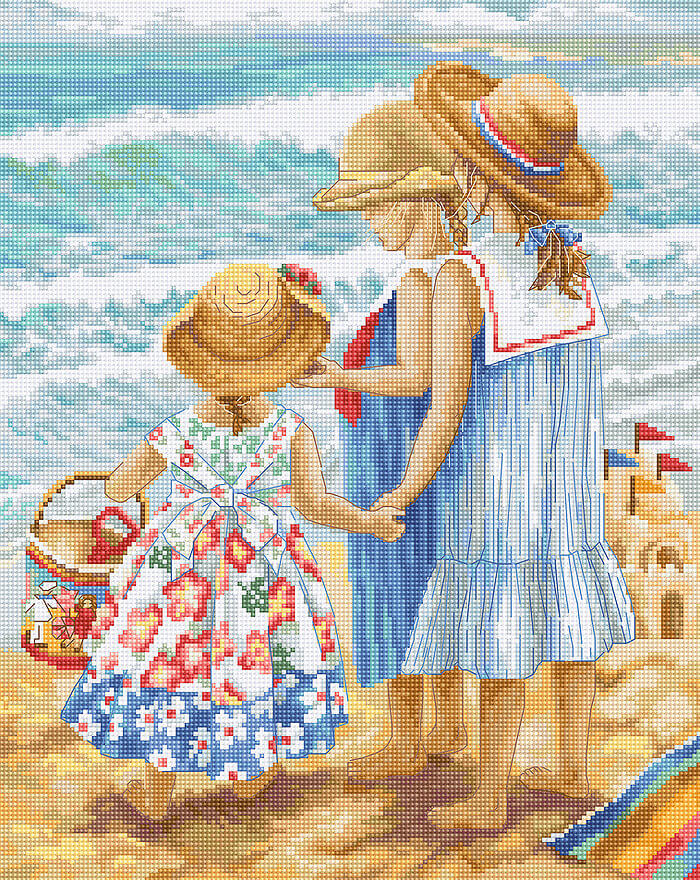 Набор для вышивки счетным крестом Сестрички (B2404) компании Luca-S содержит изображение готовой работы, схему, мулине Anchor, канву Zweigart Aida 16 ct. (цвет 100/101), иглу и инструкцию на русском языке.