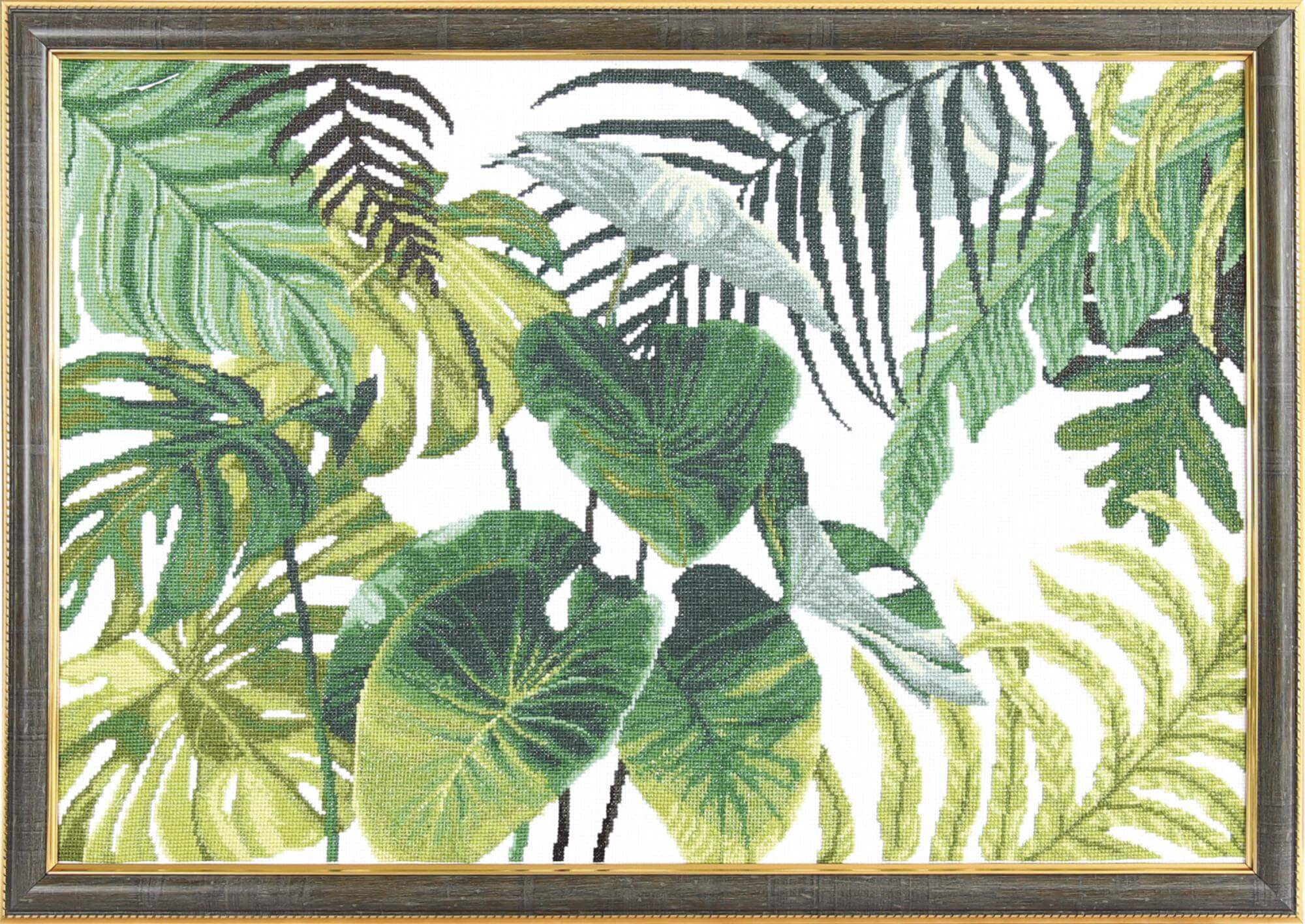 Набор для вышивания Тропические листья содержит подробную инструкцию вместе с цветной символьной схемой, канву Zweigart Aida 14, хлопковые нитки мулине Bestex - 14 цв. и иглу. Размер вышивки 56х37.5см.