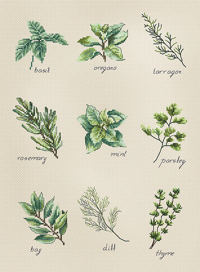 Набор для вышивки счетным крестом Cпеции и травы (B2346) компании Luca-S содержит изображение готовой работы, схему, мулине Anchor, канву Zweigart Aida 16 ct. (53), иглу и инструкцию на русском языке.