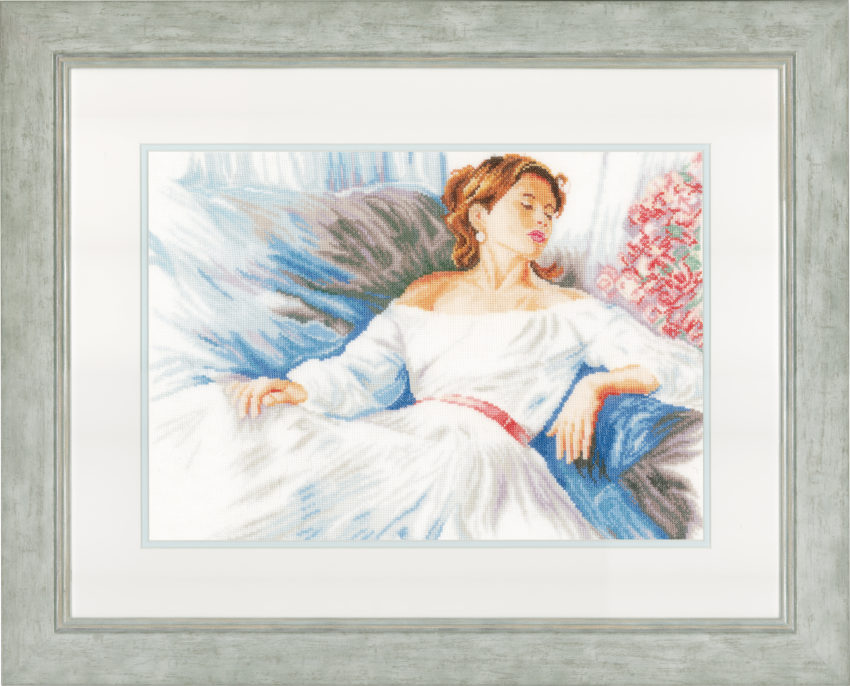 В набор для вышивания крестом Rhapsody in Blue, Голубая рапсодия LanArte (Бельгия) входит: инструкция, символьная ч/б схема, равномерная ткань Zweigart №30 лен цвета слоновой кости, х/б нитки мулине DMC - 33 цвета и игла. Размер вышитой картины: 39x28см