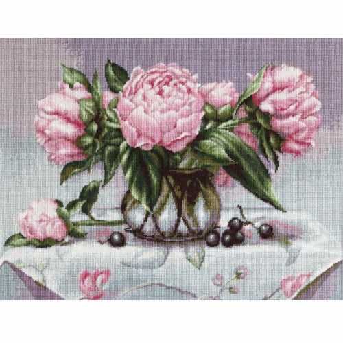 Набор для вышивки крестом Ваза с пионами компании Luca-S содержит изображение готовой работы, схему, мулине Anchor, канву Zweigart Аида 18, иглу и инструкцию на русском языке.