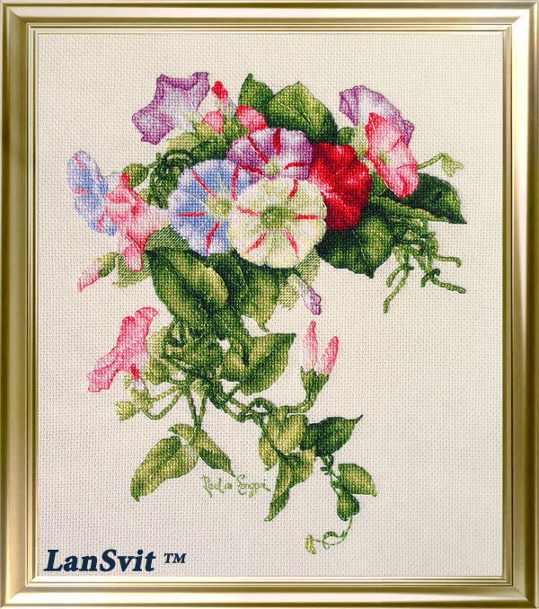 Набор для вышивания Вьюнки ТМ ЛанСвіт содержит все необходимые материалы: канва Zweigart Aida 16 с обработанными краями, мулине DMC, игла John James, символьная схема подробная инструкция и фото готовой работы.