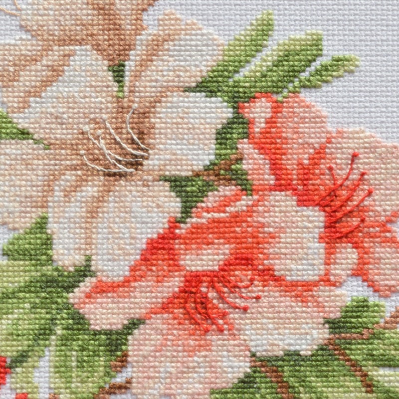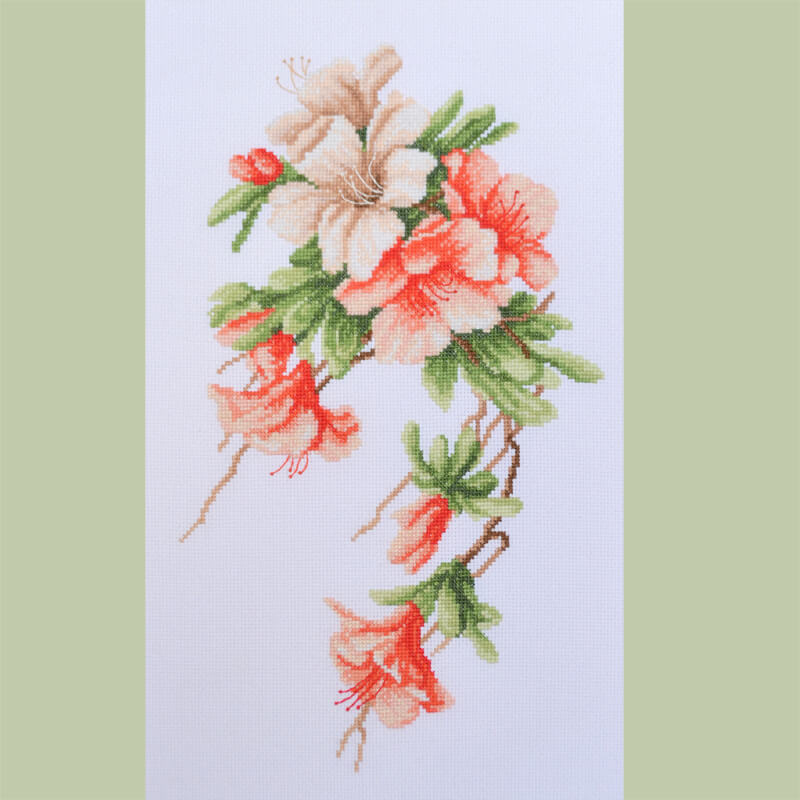 В состав набора для вышивки крестом Азалия киевского производителя Повитруля входит белая канва Aida 16, мулине ПНК им.Кирова, цветная схема и игла.