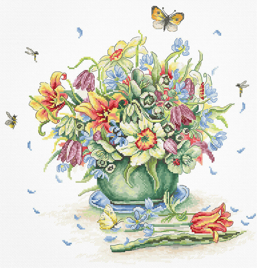 Набор для вышивки счетным крестом Апрельский букет (B7000) компании Luca-S Gold содержит изображение готовой работы, схему, мулине Anchor, канву Zweigart Aida 16 ct. (цвет 100/101), иглу и инструкцию на русском языке.