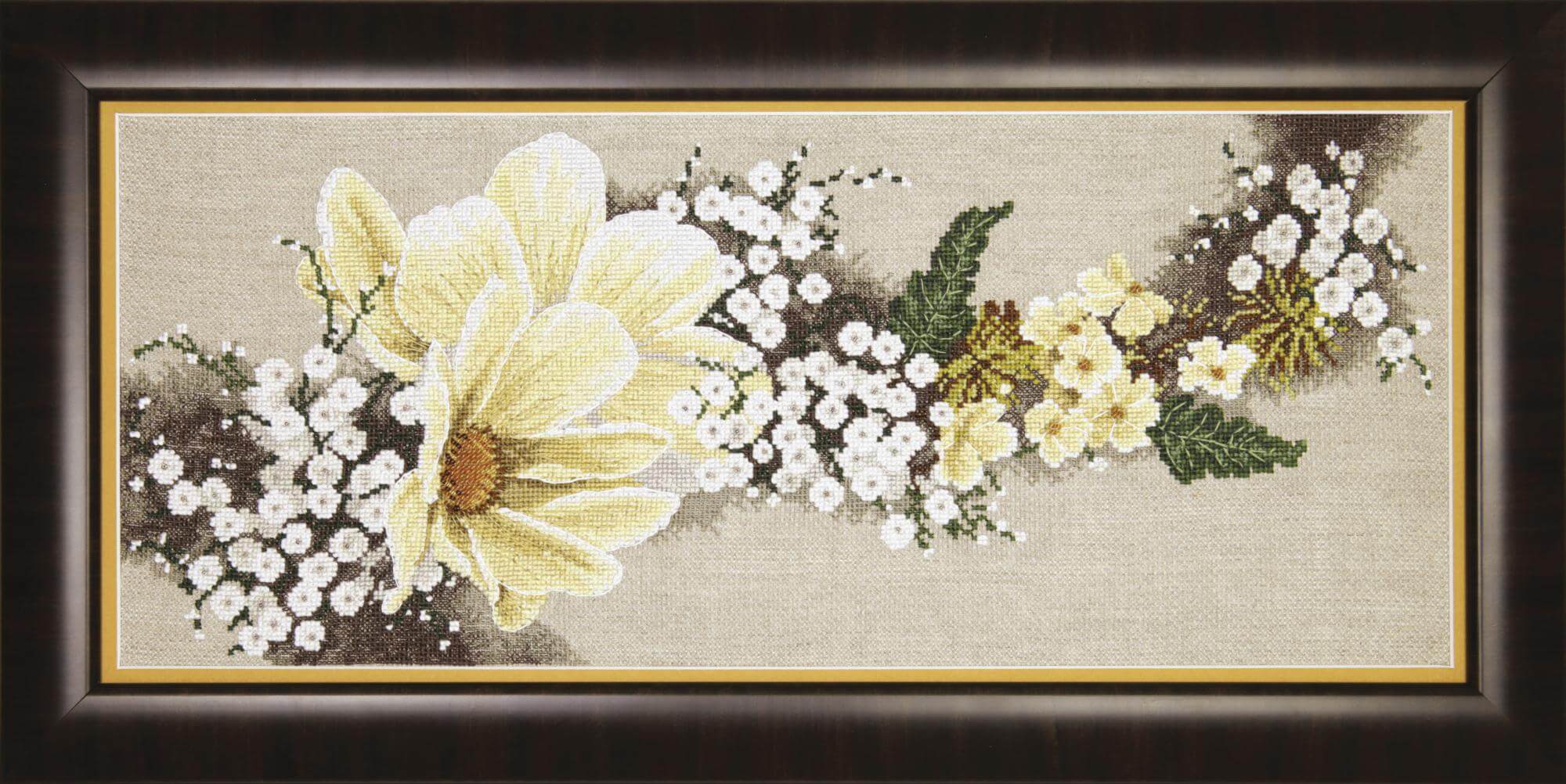 Набор для вышивания Белые цветы содержит подробную инструкцию вместе с цветной символьной схемой, канву Aida 14 лен, нитки мулине Madeira - 21 цвет, бисер Preciosa - 5 цв. и иглы. Размер вышивки 50х20.5см.