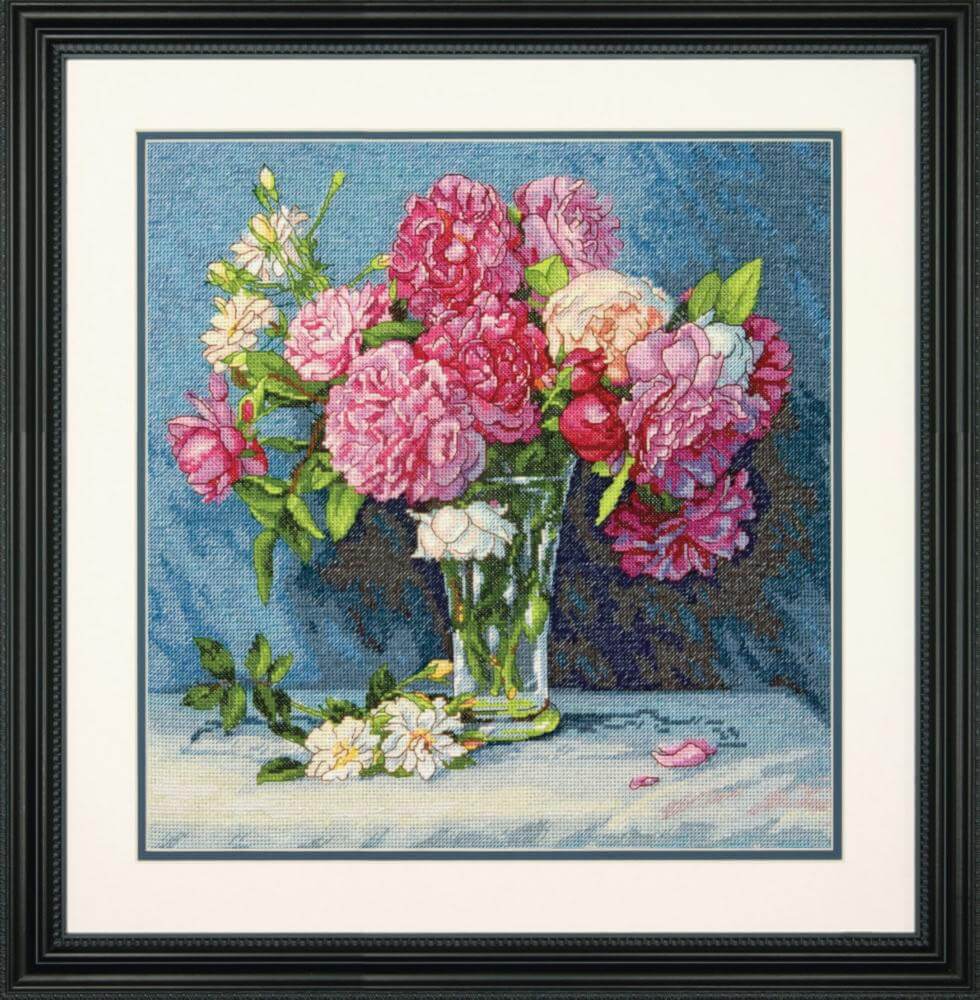 СНЯТО С ПРОИЗВОДСТВА. Комплектация набора для вышивания крестом Букет для Мэри, ТМ Dimensions: инструкция, цветная символьная схема, канва Aida 16 (светло-голубая), хлопковое мулине Dimensions - 42 цвета и игла.