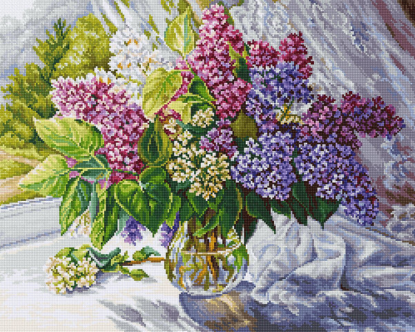 Набор для вышивки счетным крестом Букет Сирени (B7015) компании Luca-S содержит изображение готовой работы, схему, мулине Luca-S (100% хлоопок), канву Zweigart Aida 16ct. (100/101), 2 иглы, нитковдеватель и инструкцию на русском языке.