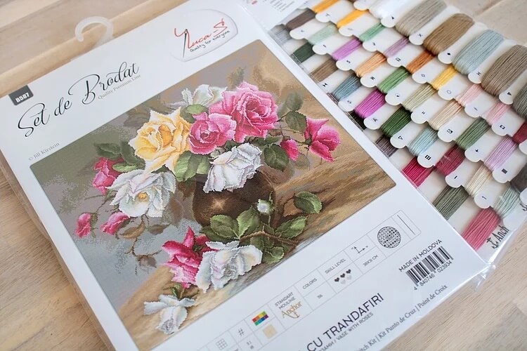 Набор для вышивки счетным крестом Ваза с розами (B587) компании Luca-S содержит изображение готовой работы, схему, мулине Anchor (100% хлопок), канву Zweigart Aida 18 ct., иглу и инструкцию на русском языке.