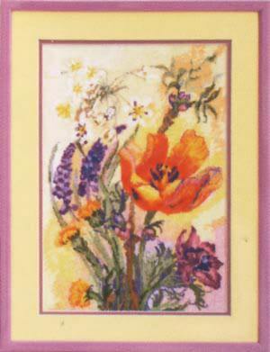 В набор для вышивки крестом Весеннее настроение (размер вышивки 24.5x35см), арт. 589, ТМ Чарівна мить входит канва Aida 16, мулине ПНК им. Кирова, игла, цветная символьная схема и инструкция.