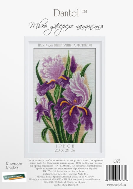Набор для вышивания крестом Ирисы ТМ Dantel содержит мулине DMC, канву Aida 14, символьную схему, иглу и инструкцию.