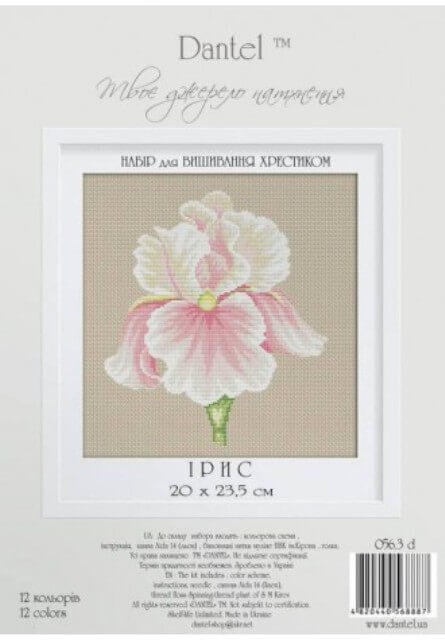 Набор для вышивания крестом Ирис ТМ Dantel содержит мулине ПНК им. Кирова, канву Aida 14, символьную схему, иглу и инструкцию.