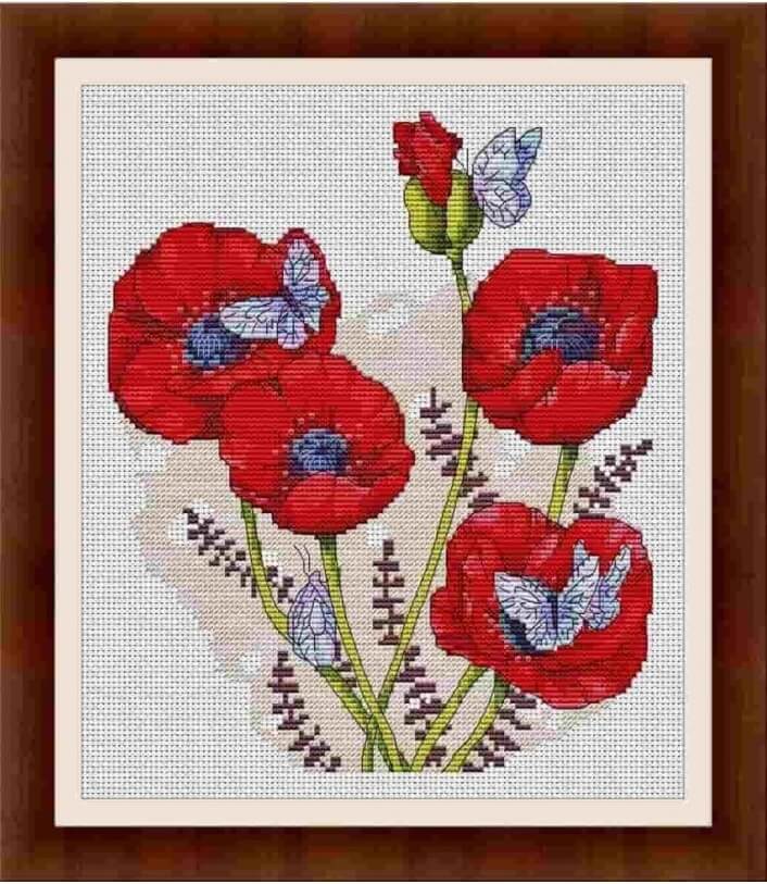 Набор для вышивания крестом Красные маки с бабочками ТМ Dantel содержит мулине PERI, канву Aida 14, символьную схему, иглу и инструкцию.
