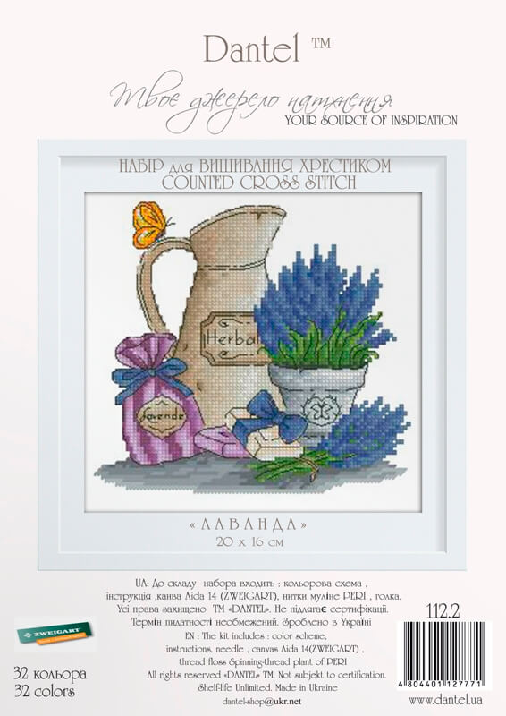 Набор для вышивания крестом Лаванда ТМ Dantel содержит мулине DMC, канву Aida 14, символьную схему, иглу и инструкцию.