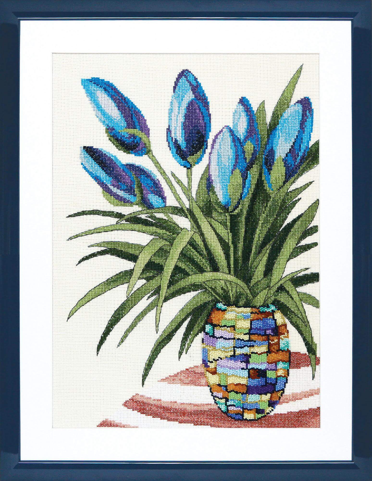 Набор для вышивания Лазоревые тюльпаны содержит цветную символьную схему, канву Aida 14 (цвет слоновая кость), нитки мулине Madeira - 22 цв., бисер Preciosa - 15 цв. и иглы. Размер вышивки 28.5х40см.