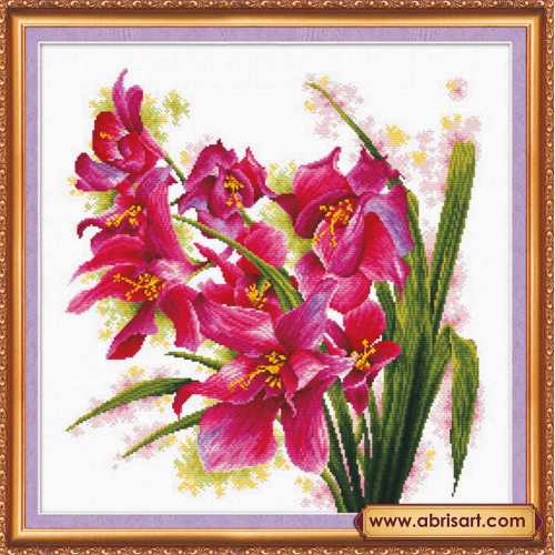 Набор для вышивки крестом Лиловые орхидеи (AH-003) ТМ Абрис Арт содержит качественные хлопковые канву и мулине, произведенные в Европе, иглу, фото готовой картины, цветную символьную схему и инструкцию.
