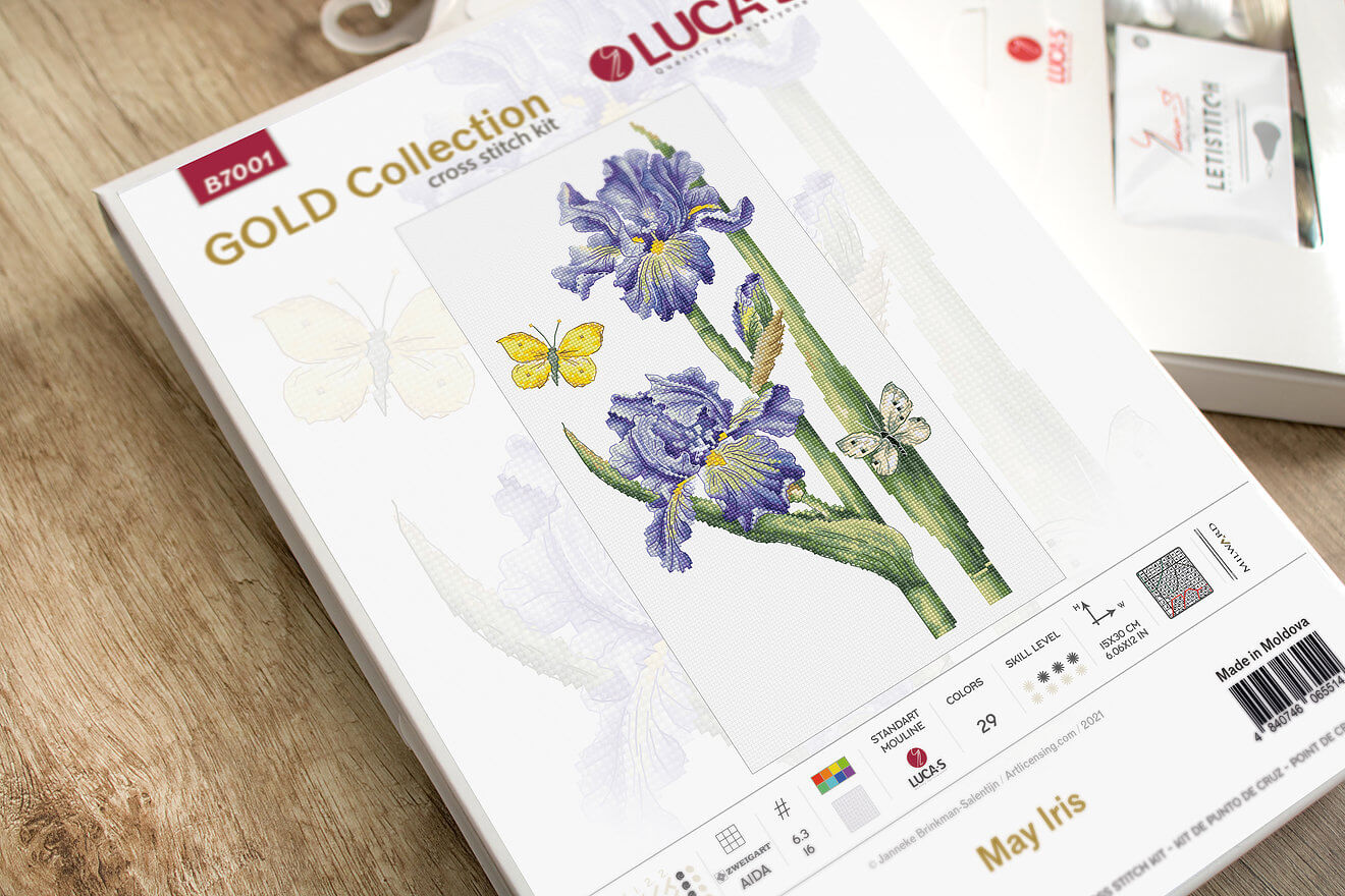 Набор для вышивки счетным крестом Майский ирис (B7001) компании Luca-S Gold содержит изображение готовой работы, схему, мулине Anchor, канву Zweigart Aida 16 ct. (цвет 100/101), иглу и инструкцию на русском языке.