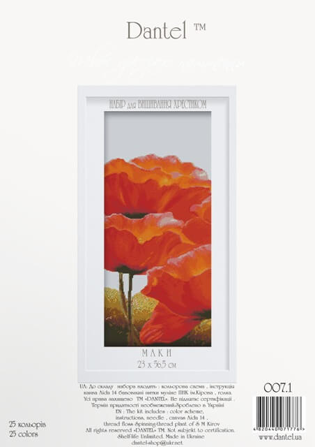 Набор для вышивания крестом Маки ТМ Dantel содержит мулине ПНК им. Кирова, канву Aida 14, символьную схему, иглу и инструкцию.
