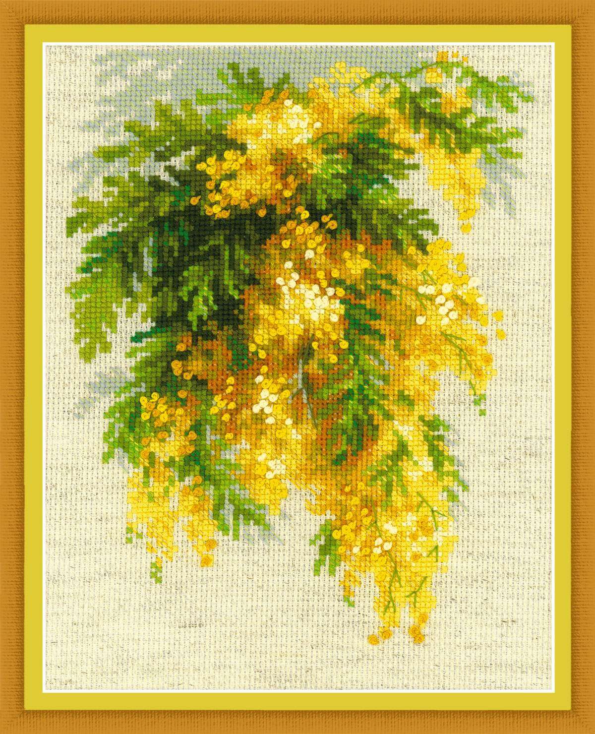 Набор для вышивания крестом Мимоза (арт. Р-1615) ТМ Риолис содержит шерстяные нитки (акрил Safil), канву (14 Aida Zweigart лён), иглу и подробную инструкцию.