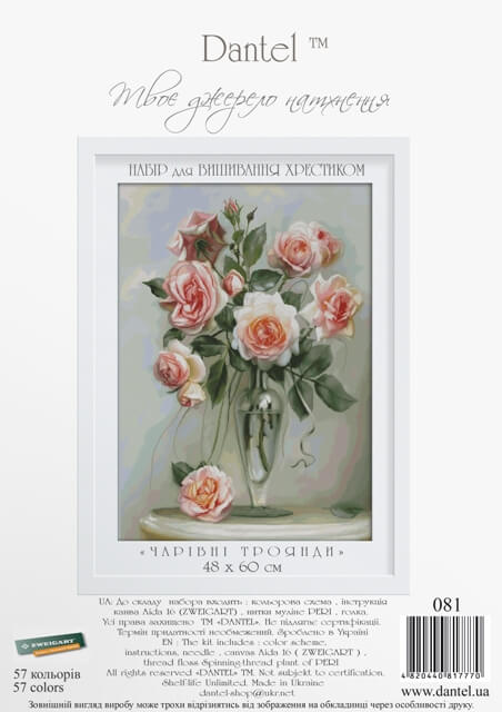 Набор для вышивания крестом Нежные Розы ТМ Dantel содержит мулине PERI, канву Aida 16, символьную схему, иглу и инструкцию.