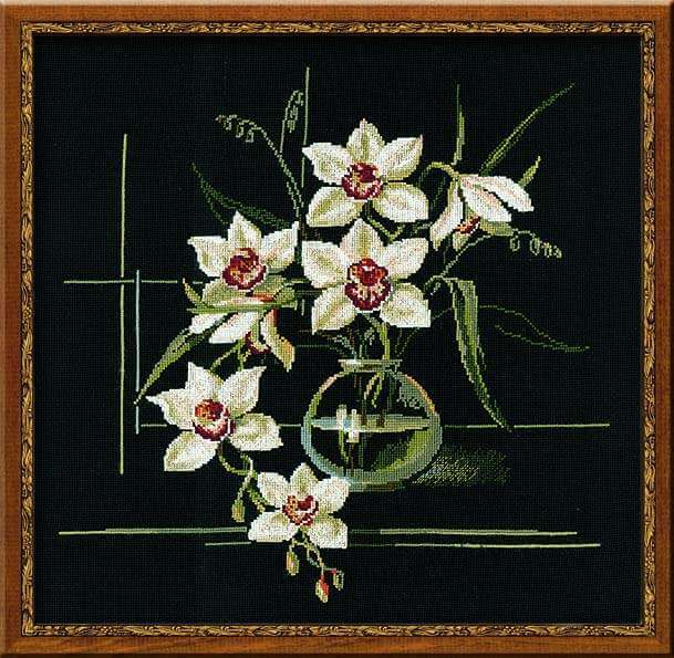 Набор для вышивания крестом Орхидеи (арт. Р-0941) ТМ Риолис содержит шерстяные нитки, канву (15 Aida Zweigart черная), иглу и подробную инструкцию.