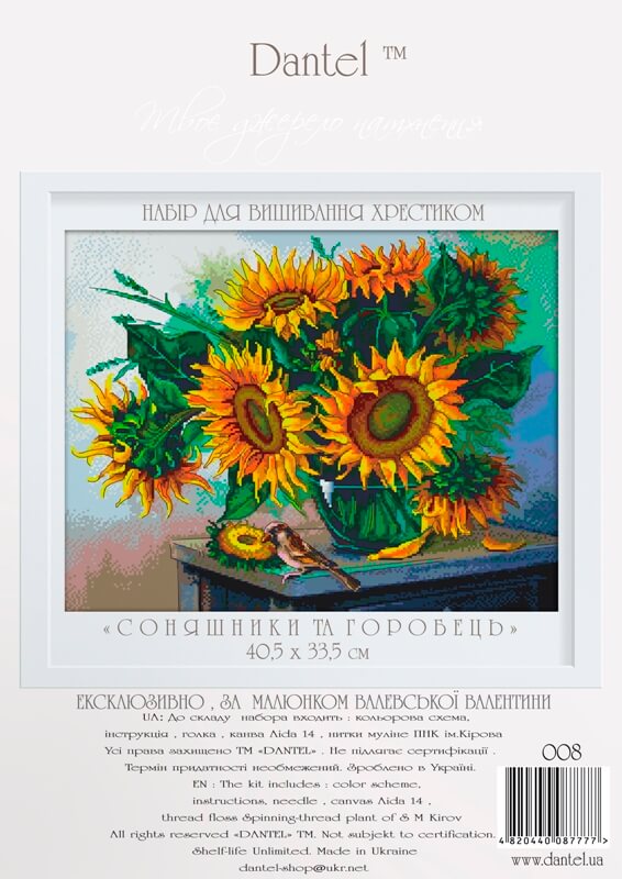 Набор для вышивания крестом Подсолнухи и воробей ТМ Dantel содержит мулине DMC, канву Aida 14, символьную схему, иглу и инструкцию.