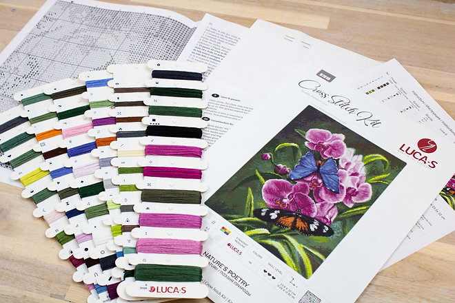 Набор для вышивки счетным крестом Поэзия природы (B7010) компании Luca-S содержит изображение готовой работы, схему, мулине Luca-S (100% хлоопок), канву Zweigart Aida 16 ct. (цвет 100/101), иглу и инструкцию на русском языке.