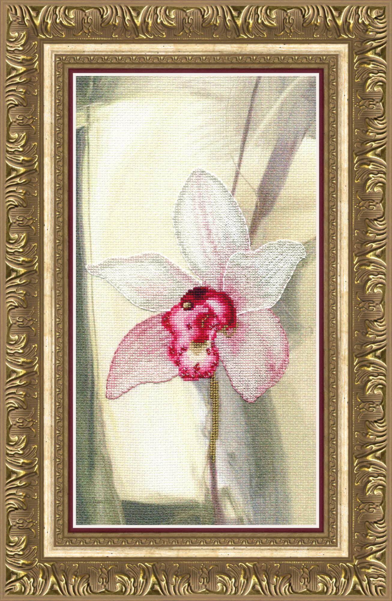 Набор для вышивания Розовая орхидея содержит подробную инструкцию вместе с цветной символьной схемой, канву с фоновым рисунком, нитки мулине Madeira - 16 цв., бисер Preciosa - 1 цвет и иглы. Размер вышивки 14.5х27см.