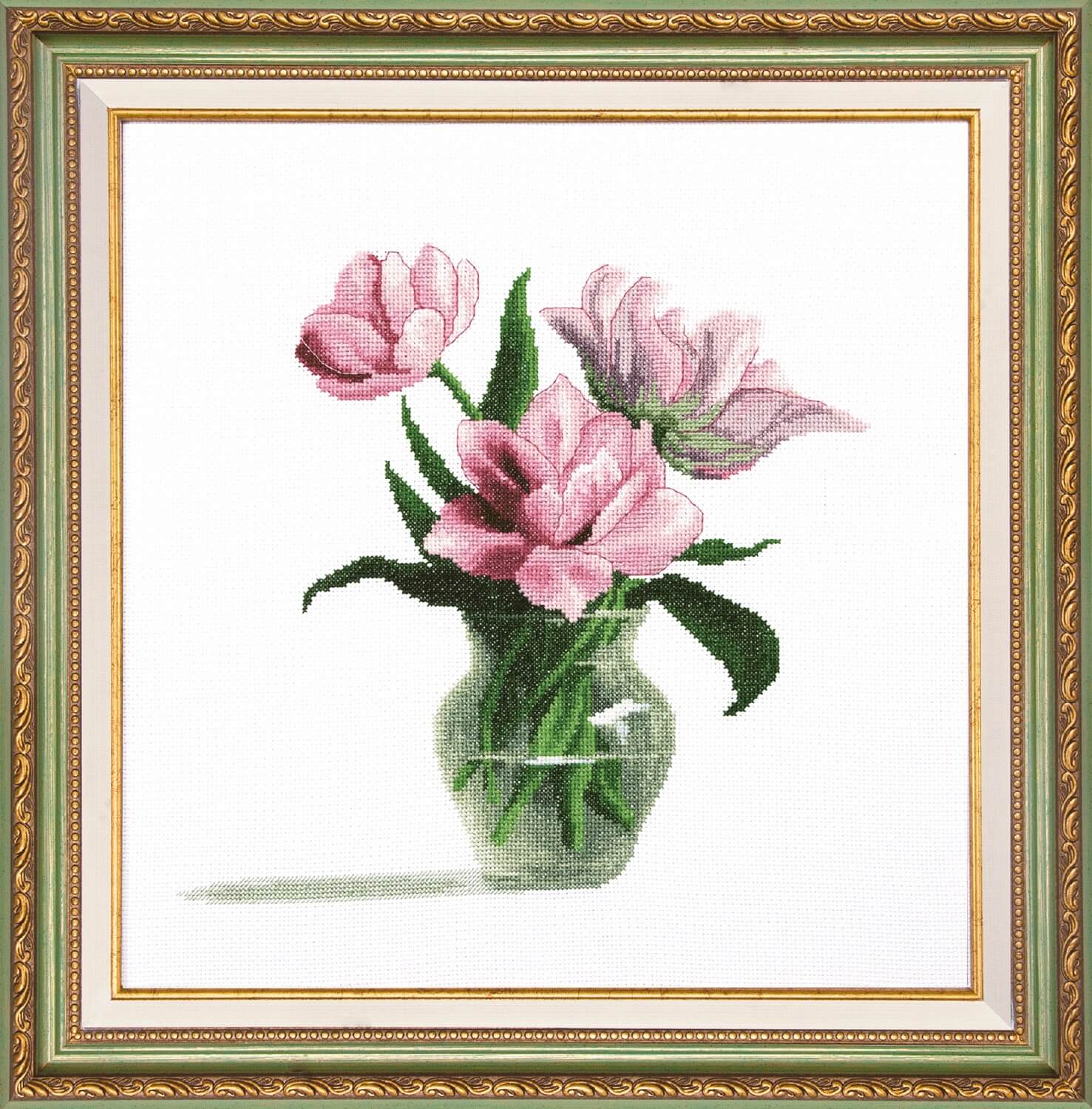 Набор для вышивания Розовые тюльпаны содержит подробную инструкцию вместе с цветной символьной схемой, канву Aida 14 Zweigart, нитки мулине Madeira и иглу. Размер вышивки 35х36см.