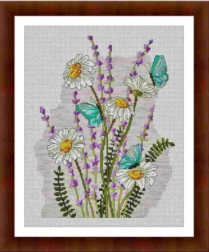 Набор для вышивания крестом Ромашки, лаванда и бабочки ТМ Dantel содержит мулине PERI, канву Aida 16, символьную схему, иглу и инструкцию.