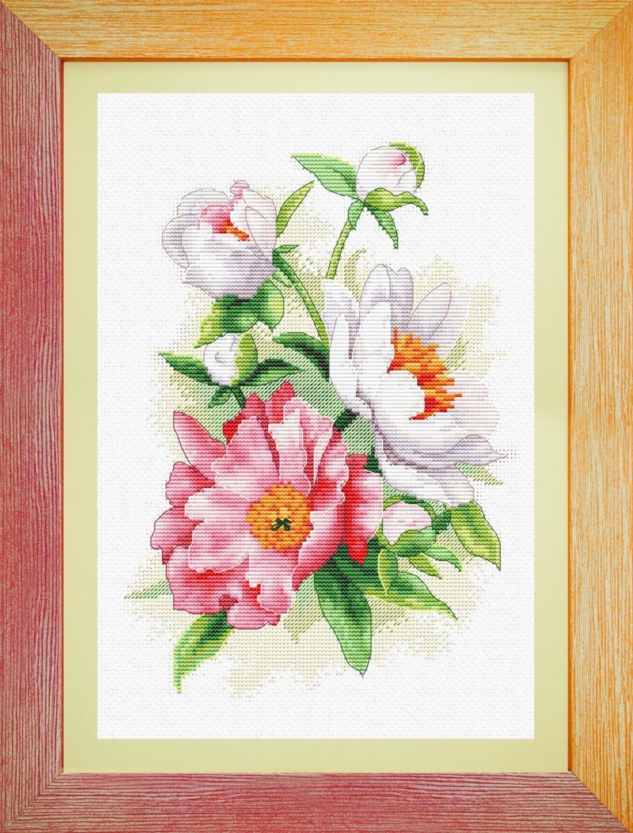 Набор для вышивки крестом Садовые пионы, VN-052, ТМ OLanTA (Картины Бисером) содержит канву Aida Zweigart 16, мулине DMC, иглу и схему для вышивки крестом.