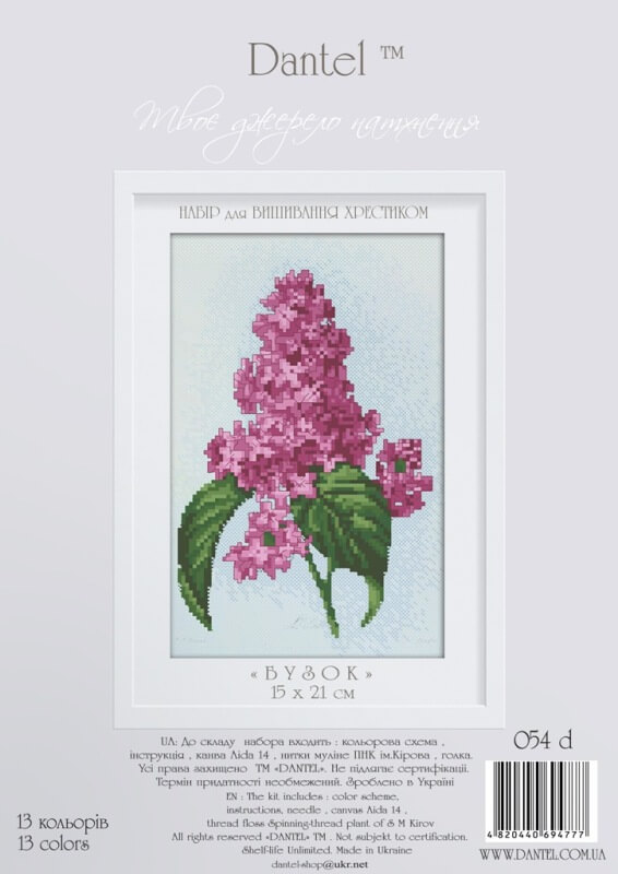 Набор для вышивания крестом Сирень ТМ Dantel содержит мулине ПНК им. Кирова, канву Aida 14, символьную схему, иглу и инструкцию.