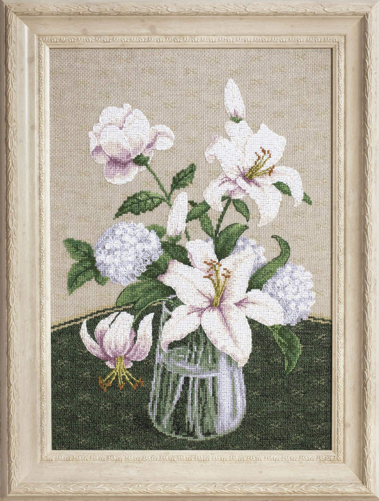 Набор для вышивания Таинство белых цв. содержит подробную инструкцию вместе с цветной символьной схемой, канву Aida 14 лен, нитки мулине Madeira - 21 цвет и иглу. Размер вышивки 28х40см.