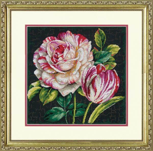 Комплектация набора для вышивания крестом Тюльпаны, ТМ Dimensions: инструкция, цветная символьная схема, канва Aida 14 (черная), хлопковое мулине Dimensions - 30 цветов и игла.