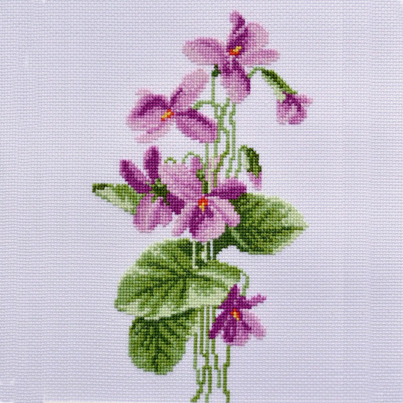 В состав набора для вышивки крестом Фиалки киевского производителя Повитруля входит белая канва Aida 16, мулине ПНК им.Кирова, цветная схема и игла.