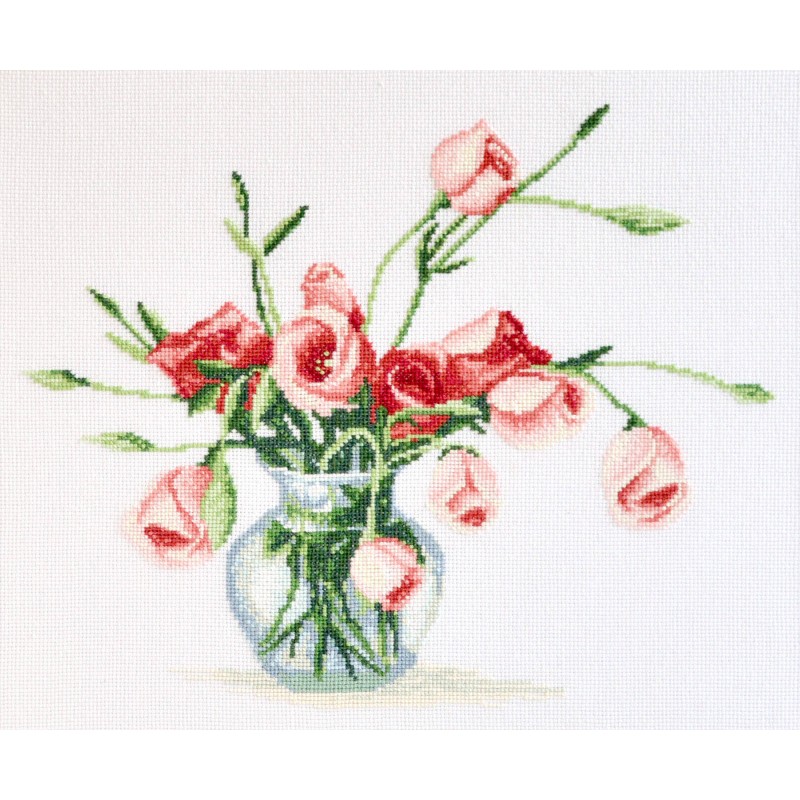 В состав набора для вышивки крестом Эустома киевского производителя Повитруля входит белая канва Aida 14, мулине Peri, цветная схема и игла.
