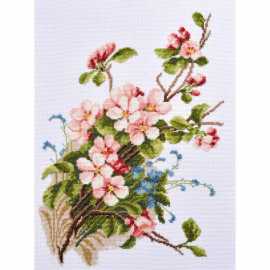 В состав набора для вышивки крестом Яблони в цвету киевского производителя Повитруля входит белая канва Aida 14, мулине Peri, цветная схема и игла.