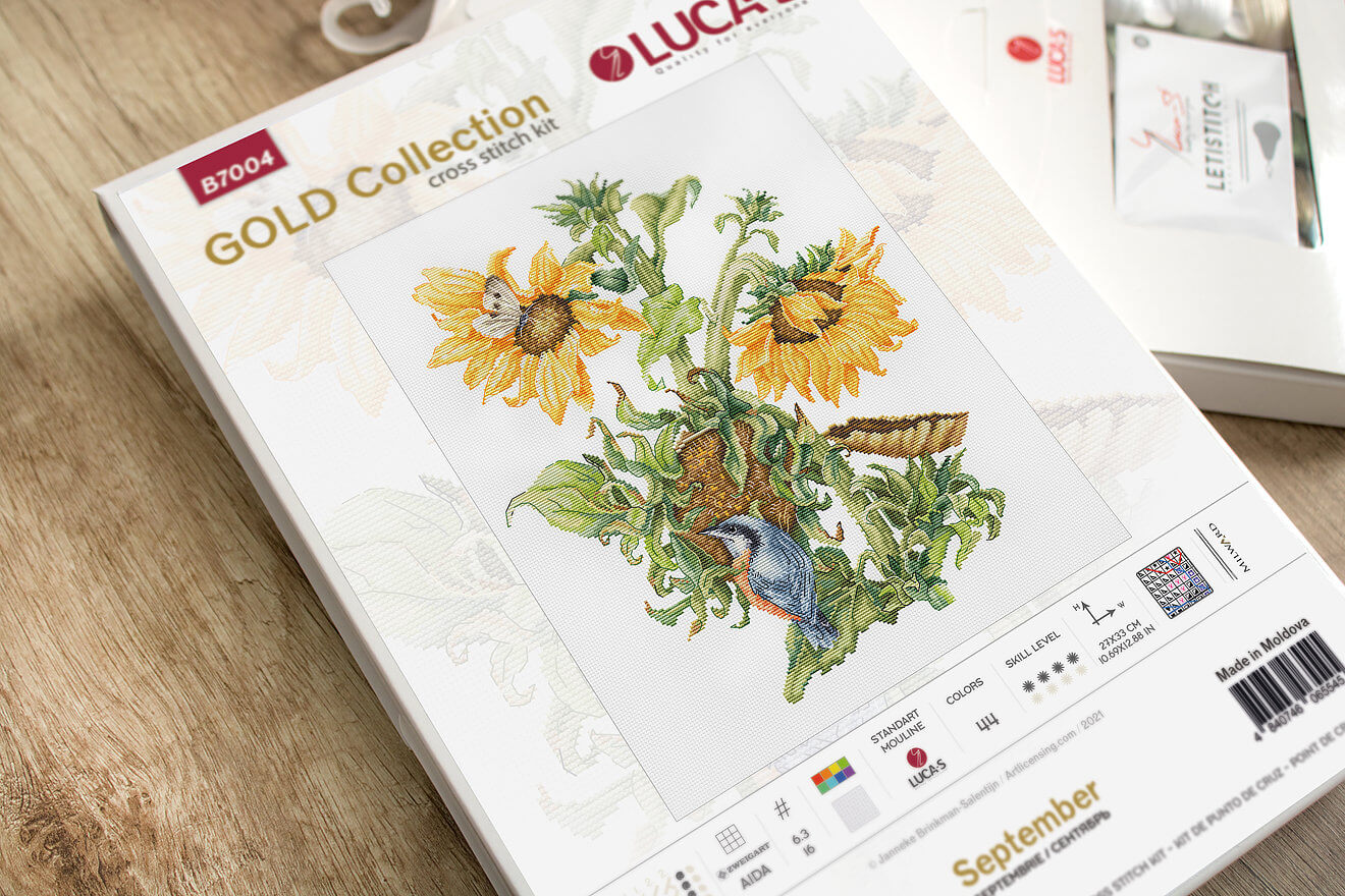 Набор для вышивки счетным крестом Cентябрь (B7004) компании Luca-S Gold содержит изображение готовой работы, схему, мулине Anchor, канву Zweigart Aida 16 ct. (цвет 100/101), иглу и инструкцию на русском языке.