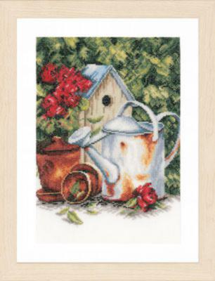 Набор для вышивки крестом Watering Can & Birdhouse, Садовая лейка и скворечник, 20x26см, LanArte