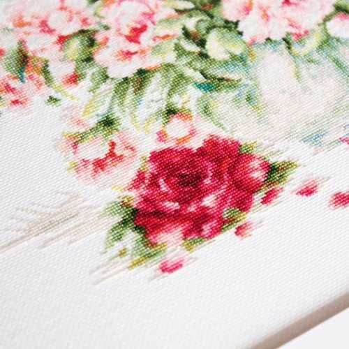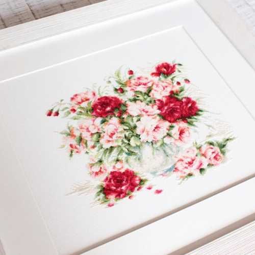 Набор для вышивки крестом Пионы компании Luca-S содержит изображение готовой работы, схему, мулине Anchor, канву Zweigart Lugana 25, иглу и инструкцию на русском языке.
