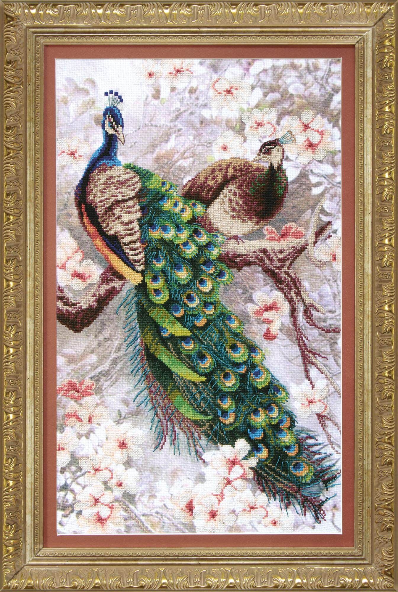 Набор для вышивания крестом Два павлина в цветущей магнолии содержит подробную инструкцию и цветную символьную схему, ткань для вышивания с нанесенным рисунком, х/б мулине Bestex - 31 цвет и иглу. Внимание! Схема не нанесена на канву, она входит в набор отдельно на бумаге, а рисунок на ткани является фоновым изображением.
