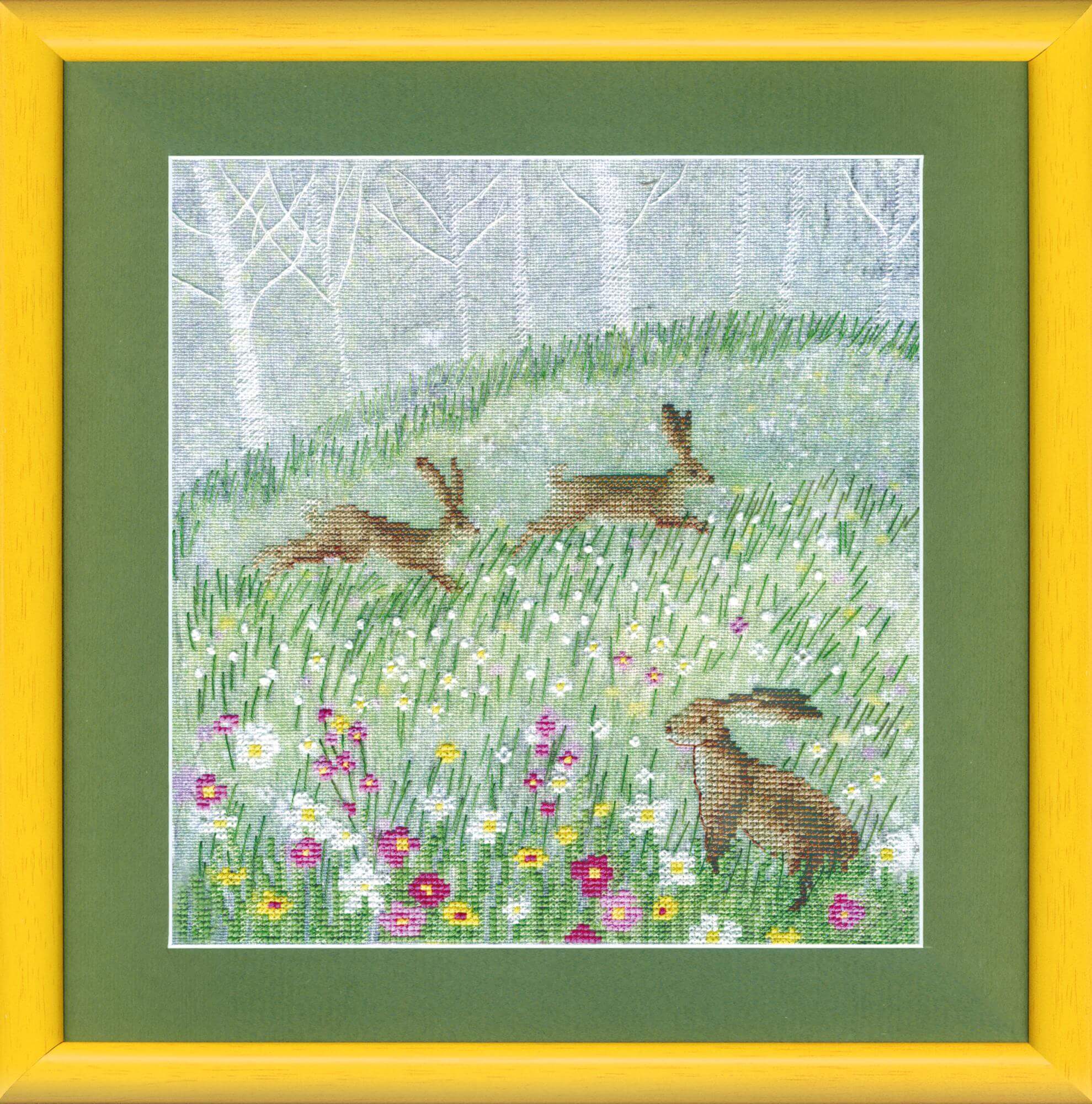 Набор для вышивания Летние зайцы содержит подробную инструкцию вместе с цветной символьной схемой, Murano 32, нитки мулине Madeira - 14 цв. и иглу. Размер вышивки 20х20см. Внимание! Схема не нанесена на канву, она входит в набор отдельно на бумаге, а рисунок на ткани является фоновым изображением.