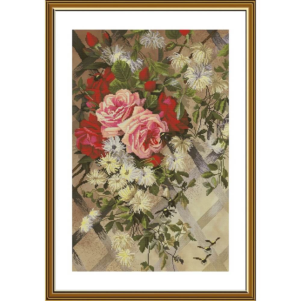 Набор для вышивки счетным крестом на канве с фоновым рисунком В саду из роз компании Новая Слобода состоит из канвы Aida 16 с нанесенным рисунком, ниток мулине Avrora 120, иглы для вышивания, цветной схемы и подробной инструкции. Внимание! Схема не нанесена на канву, она входит в набор отдельно на бумаге, а рисунок на ткани является фоновым изображением.