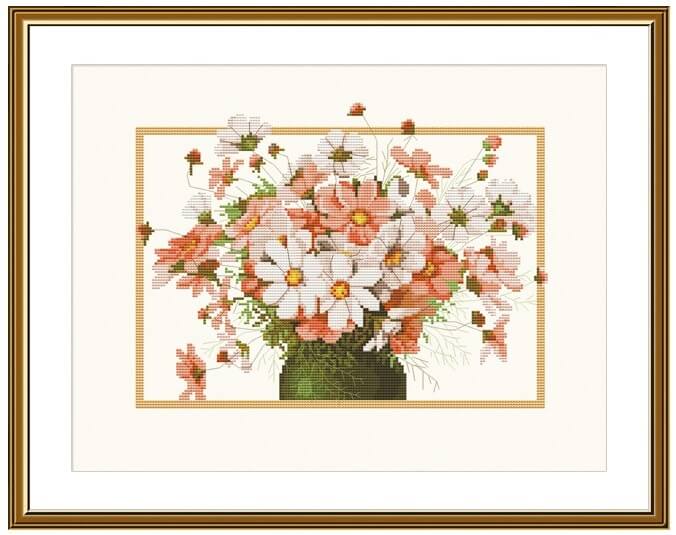 Набор для вышивки счетным крестом на канве с фоновым рисунком Букет космеи компании Новая Слобода состоит из ниток мулине Palmira 180, белой канвы Aida 14, иглы для вышивания, цветной схемы и подробной инструкции. Внимание! Схема не нанесена на канву, она входит в набор отдельно на бумаге, а рисунок на ткани является фоновым изображением.