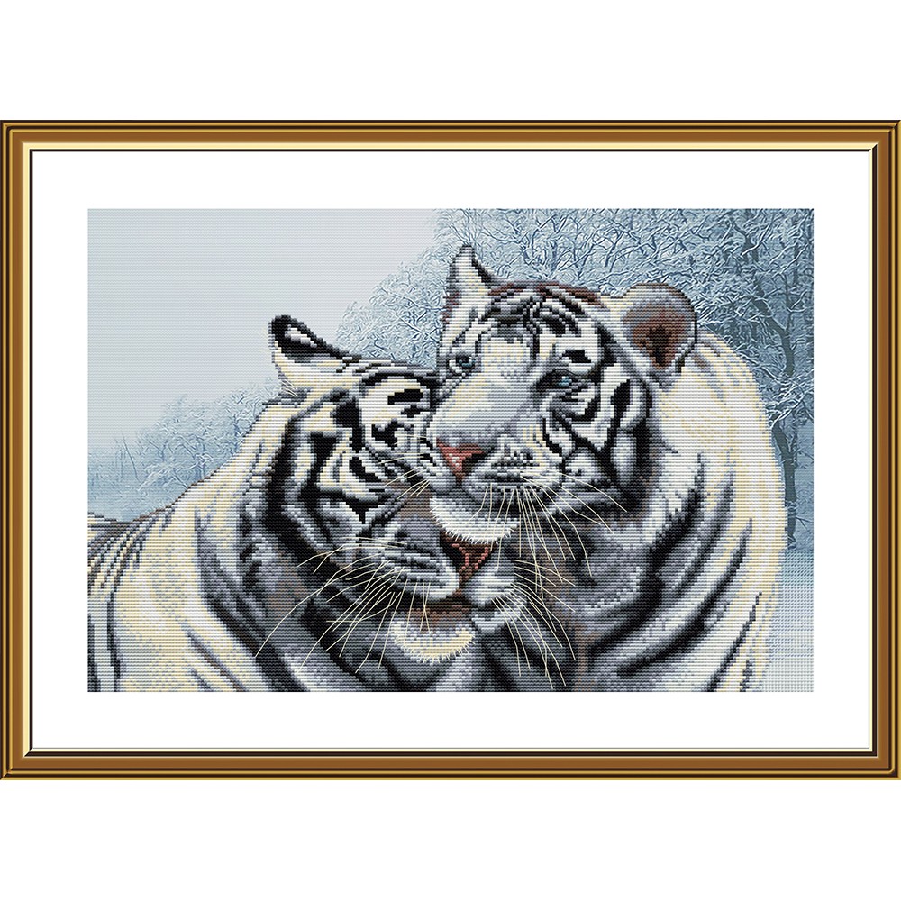 Набор для вышивки счетным крестом на канве с фоновым рисунком Бенгальские тигры компании Новая Слобода состоит из ниток мулине Palmira 180, белой канвы Aida 14, иглы для вышивания, цветной схемы и подробной инструкции. Внимание! Схема не нанесена на канву, она входит в набор отдельно на бумаге, а рисунок на ткани является фоновым изображением.