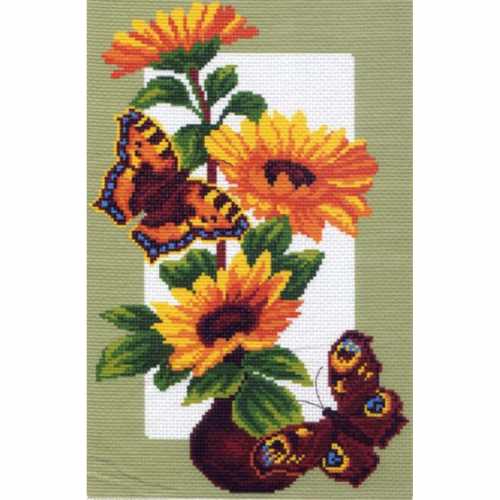 Набор для вышивания крестом Подсолнухи и бабочка (0473N) ТМ Матренин посад содержит канву Aida 14 с нанесенным на нее цветным рисунком, мулине ПНК им.Кирова (10 цветов), иглу и инструкцию по вышивке.