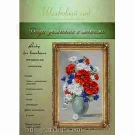 Набор для вышивки атласными лентами Ваза ромашек с маками (ВЛ-Н-1060) ТМ Шелковый Сад содержит шелковые ленты, бисер, ткань с нанесенным рисунком-схемой, подробную инструкцию и фото работы. Так как производитель не комплектует наборы иглами, мы их Вам под
