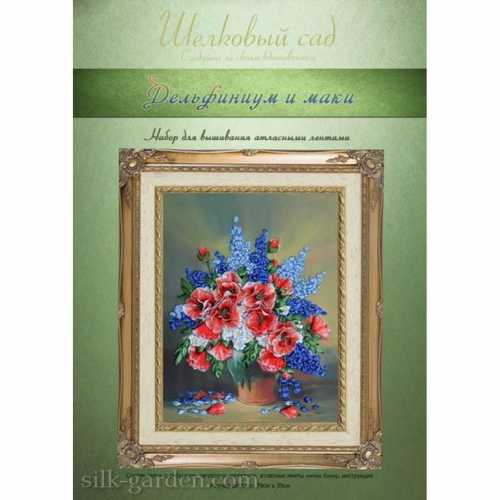 Набор для вышивки атласными лентами Дельфиниум и маки (ВЛ-Н-1086) ТМ Шелковый Сад содержит шелковые ленты, бисер, ткань с нанесенным рисунком-схемой, подробную инструкцию и фото работы. Так как производитель не комплектует наборы иглами, мы их Вам подарим